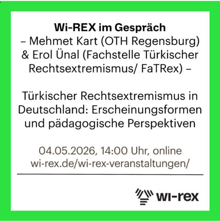 FaTRex ist zu Gast beim Wissensnetzwerk Rechtsextremismusforschung (Wi-REX) / Institut für interdisziplinäre Konflikt- und Gewaltforschung.  Erol Ünal (Fachstelle Türkischer Rechtsextremismus/ FaTRex) und Mehmet Kart (OTH Regensburg) geben Inputs zum Thema. Thema ist türkischer Rechtsextremismus in Deutschland, seine Erscheinungsformen und pädagogische Perspektiven.