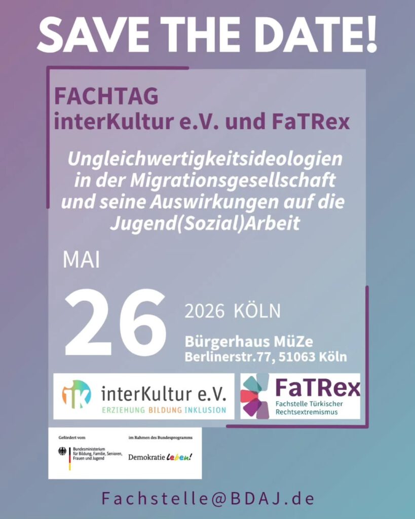 Am 26. Mai 2026 veranstalten interKultur e.V. und FaTRex in Köln einen gemeinsamen Fachtag zum Thema „Ungleichwertigkeitsideologien in der Migrationsgesellschaft und seine Auswirkungen auf die  Jugend(Sozial)Arbeit“. Der Fachtag schafft einen Raum für fachliche Einordnung, Austausch und klare Perspektiven. Wir freuen uns sehr und arbeiten bereits intensiv am Programm. Infos zur Anmeldung und zum Programm folgen!
