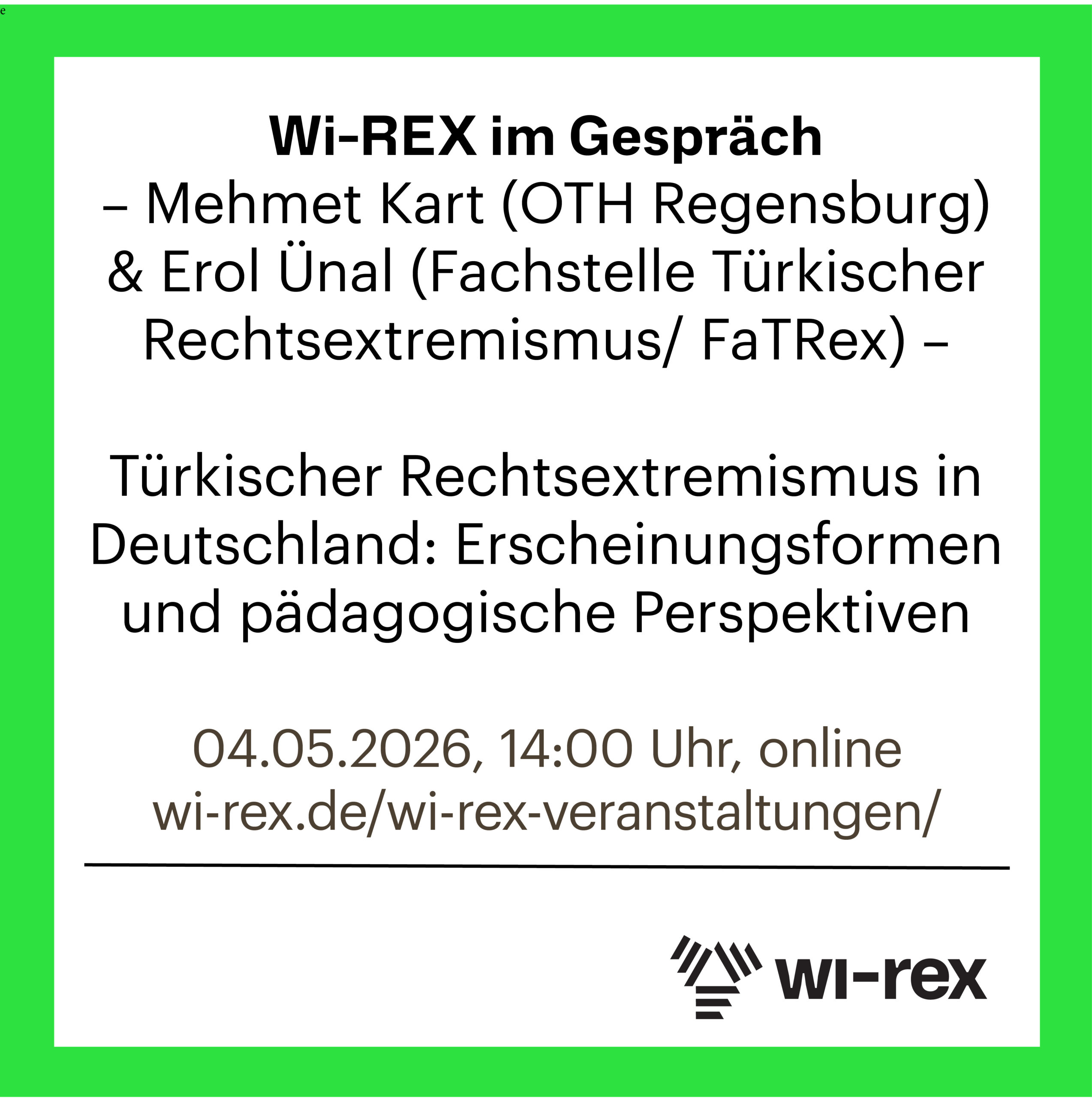 „Wi-REX im Gespräch“ Türkischer Rechtsextremismus in Deutschland: Erscheinungsformen und pädagogische Perspektiven 04. Mai 2026 | 14.00 -15:30 Uhr | Online STREAMING via ZOOM FaTRex ist zu Gast beim Wissensnetzwerk Rechtsextremismusforschung […]